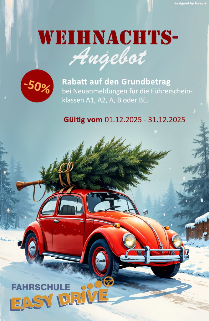Die Fahrschule Easy Drive macht dir dieses Jahr das perfekte Weihnachtsgeschenk. Vom 01. Dezember bis 31. Dezember 2025 läuft unser exklusiver Weihnachtskurs